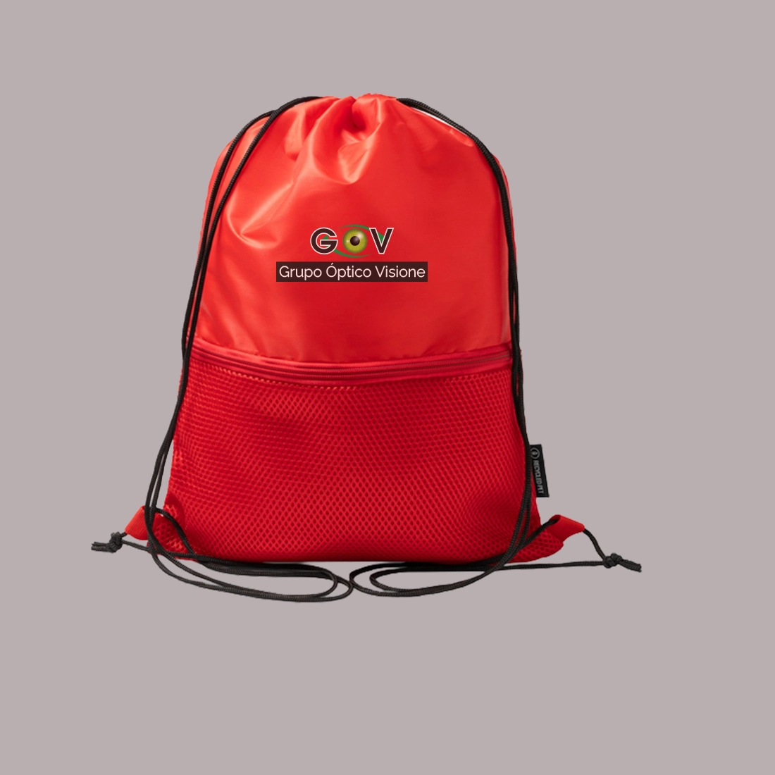 Bolso morral con cordones confeccionada de tela RPET con bolsillo exterior en tejido acolchado con cierre para el transporte de objetos más pequeños.
